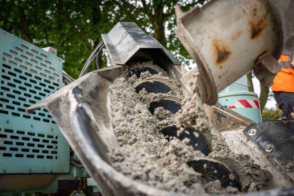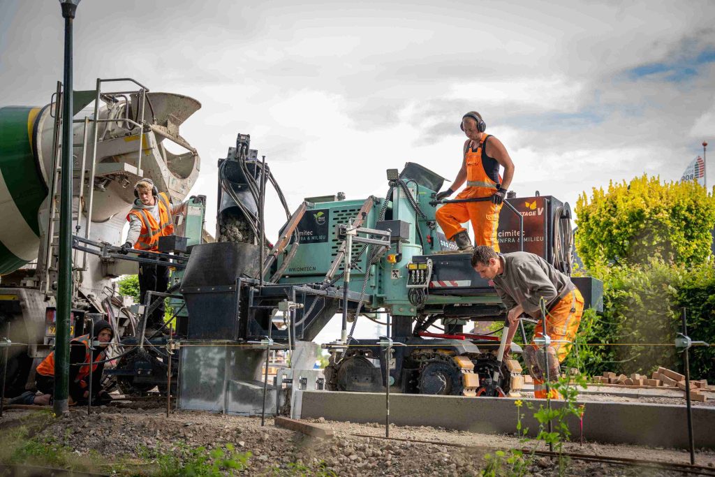We brachten de kantopsluiting aan met de Curbmachine 2.0. Deze machine legt de betonnen band direct op locatie aan. Het beton voeren we continu aan, persen we in vorm en voorzien we tegelijk van wapening. Zo ontstaat in één vloeiende lijn een sterke, naadloze kantopsluiting met een strakke afwerking.