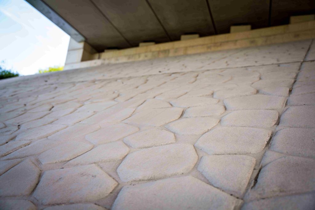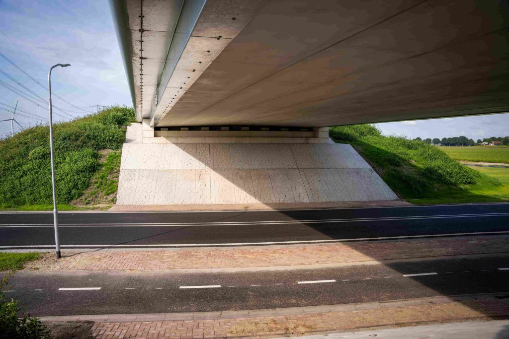 We brachten een gewapende betonverharding aan en voorzagen het oppervlak van een Basaltonmotief. Zo kreeg het talud de uitstraling van straatwerk, maar zonder losse stenen die vandalen kunnen loshalen of op de weg kunnen gooien. Het resultaat is een solide verharding die niet verzakt en niet wegspoelt.